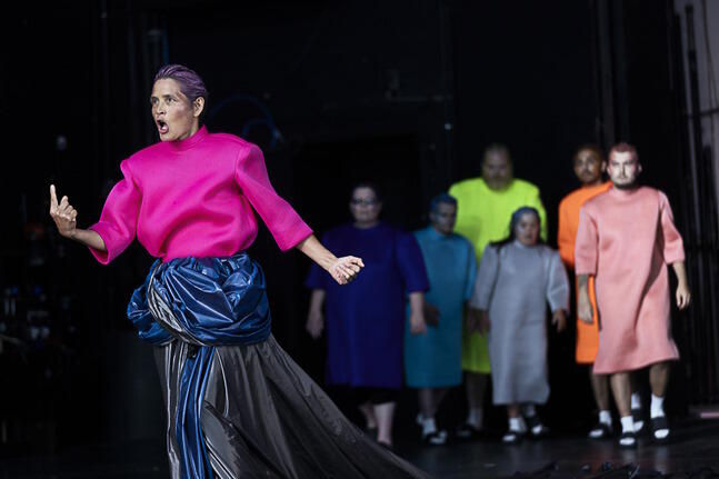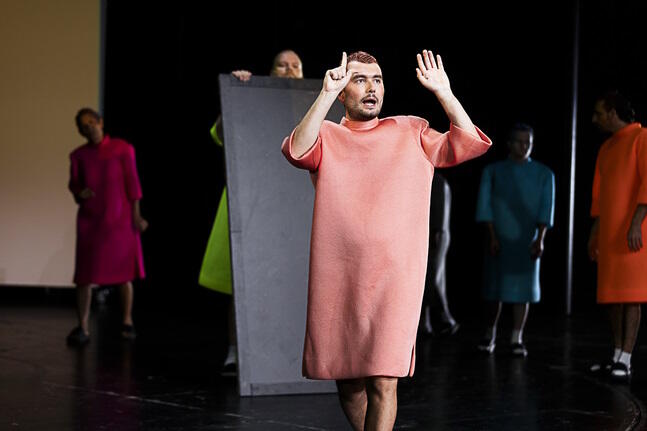 Kunstworte werden kreativ aneinandergereiht. Die Schauspieler*innen in bunten Kostümen machen nicht viel, außer ab und zu miteinander zu sprechen und rumzualbern.