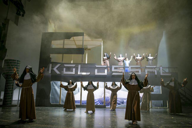 Die Szenerie ist betont bunt und erinnert an traditionelle Weihnachtsmärchen mit Bergen aus Pappmaschee, farbig gemalten Kapellen und echtem Regen. In einem mächtigen Raben mit funkelnden Augen und beweglichem Schnabel sitzt Kerstin Graßmann, verkündet antikapitalistische Parolen und beschwört den Gemeinschaftsgeist des Theaters. An Kostümen wird nicht gespart. Die Chöre tragen Mönchskutten und Nonnentracht, später auch glänzende Klamotten mit Sonnen und Sternen im Haar. Maria (Aminata Toscano) trägt ein blaues Kostüm wie gemalt, ähnlich bilderbuchmäßig die drei heiligen Königinnen (Margarita Breitkreiz, Inga Busch, Christine Groß).