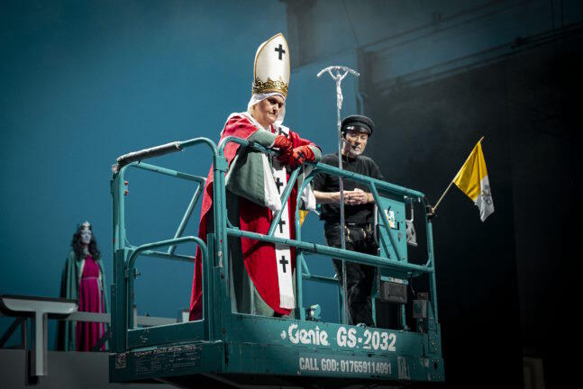Video fehlt auch nicht. Der neue Papst spricht einen Jugendlichen selig, wir sehen Tippi Hedren als Retterin von Kindern aus dem Hitchcock-Film „Die Vögel“ oder Polizisten, die im Schlamm stecken oder in denselben hineinfallen. Eingebunden in den Wirrwarr ist dankenswerterweise ein bunter Musik-Mix: Kirchenlieder, Adventsgesang, Blues, Volksmusik und Volkstänze. Das bringt Entspannung in den sonst eher angestrengten Abend, der immer komisch sein will, aber diesen Wunsch nur selten erreicht.