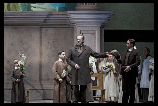 Nicht allein durch das Solisten-Trio wird diese von Alvis Hermanis inszenierte Tosca prachtvoll. Der Staatsopernchor und der Kinderchor der Staatsoper formen das „Te Deum“ zum Hochamt einer Institution, die der Staatsgewalt einen religiösen Prunkmantel umhängt. Weltlicher und kirchlicher Machtanspruch verschmelzen in Puccinis genialer Partitur zu einer Kraft, die sich auftürmt wie eine Wand aus schwarzem Wasser. Druckvoll künden die Chöre und die Staatskapelle Berlin unter der Leitung von Petr Popelka vom Vernichtungspotenzial dieser unheiligen Allianz.