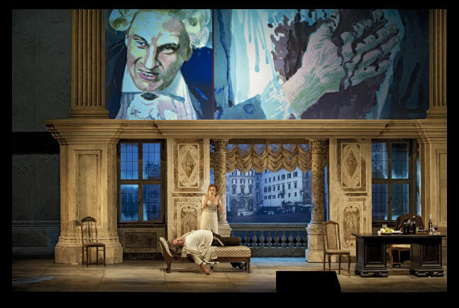 So schiebt sich die Ausstattung von Kristine Jurjane in den Vordergrund. Sie nutzt den oberen Teil der Bühne, um Gemälde und Zeichnungen der römischen Originalschauplätze zu zeigen: die Kirche Sant’ Andrea della Valle, der Palazzo Farnese, die Engelsburg. Von einer Graphic-Novel-Ästhetik spricht die Marketing-Abteilung des Hauses. Das ist stramm behauptet angesichts einer losen Ikonografie, die mit barocken und akademisch-sakralen Versatzstücken spielt. Schon die blonde Maria-Magdalena, die Cavaradossi in der Kirche malt, atmet mit ihren verzückt verdrehten Augen einen Hauch von Edelkitsch. Scarpias Arbeitszimmer im Palazzo Farnese öffnet sich zu einem großen Balkon hin. Das ist prachtvoll, doch legt sich die Aura des einst bekannten Parfümklassikers darüber: blumig, süß, nostalgisch – und frei von jeder irritierenden Note.