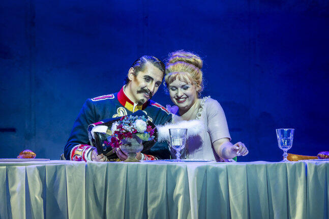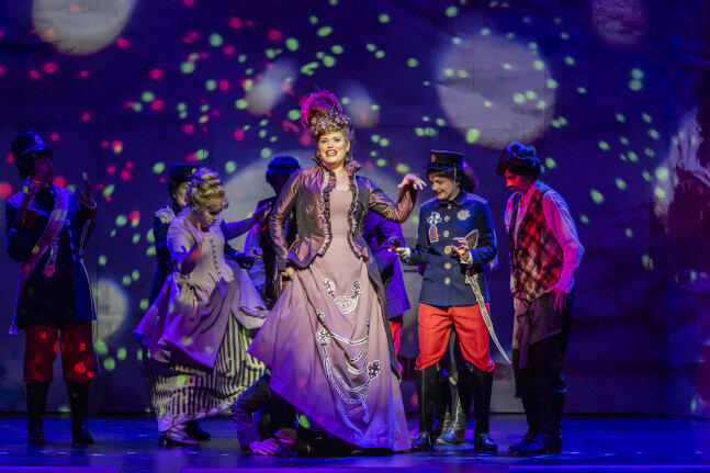 Vor der Uraufführung bekam Strauß Manschetten vor der eigenen Courage. Er fürchtete das Skandalpotenzial einer antiklerikal-revolutionären Göttin der Vernunft im katholischen Österreich. Krankheit vorschützend, blieb er der Premiere fern. Doch die geriet zum Erfolg und erlebte immerhin 35 Folgevorstellungen. Dennoch verschwand das Werk hernach in der Versenkung. An der inspirierten Partitur lag’s gewiss nicht. Voller Verve und Esprit treten die Hildesheimer seit dem Premierentermin just am 200. Geburtstag des Komponisten fortgesetzt den Beweis an. Der Opernchor und Jugendchor des Hauses legen sich unter Achim Falkenhausen mit Verve und Sinn für die tänzerischen Rhythmen ins Zeug. Florian Ziemen am Pult der tfn_philharmonie beweist gleichermaßen Feuer, rhythmische Prägnanz und Gespür für des „Walzerkönigs“ zuweilen weit ausschwingendes Melos. Charmant, durchsetzungsfähig und vokal wendig verkörpert Gabrielé Jocaité die Volkssängerin Ernestine. Für Comtesse Mathilde de Nevers bietet Neele Kramer von ihrem blühenden und gut fokussierten Mezzosopran beglaubigtes Standesbewusstsein und befehlsgewohnte Zielstrebigkeit auf. Eddie Mofokeng gewinnt als tenoraler Herzensbrecher Captaine Robert. Indem Tobias Hieronimi den Maßstab für den menschenfreundlichen Gutsbesitzer Bonhomme setzt, so begegnet im langjährigen Hildesheimer Hausbass eine der angenehmsten Figuren des Operettengenres überhaupt. Alle weiteren Solistinnen und Solisten tragen zur geschlossenen Ensembleleistung bei.