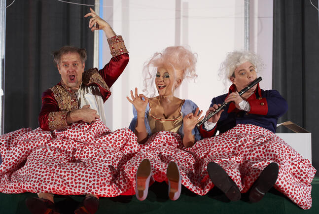 Das Trio spielt und singt in der Inszenierung Björn Reinkes, die gekonnt auf den Spuren der Commedia dell’arte flaniert, im Überschwang der Gefühle. Dariusz Machej gibt den Don Belflor mit großvolumigem Bass, Nathan Northrup singt den Tracolin mit tenoralem Sanftmut und heldischem Spitzenton. Elena Fink aber ist diejenige, die sich durch waghalsige Koloraturen in den Vordergrund jubiliert. Adolphe Adam nutzt dazu das Lied Ah! vous dirai-je, Maman – auch als indirekte Verbeugung vor Mozarts Klaviervariationen über das Thema.