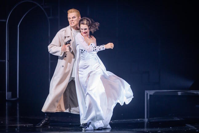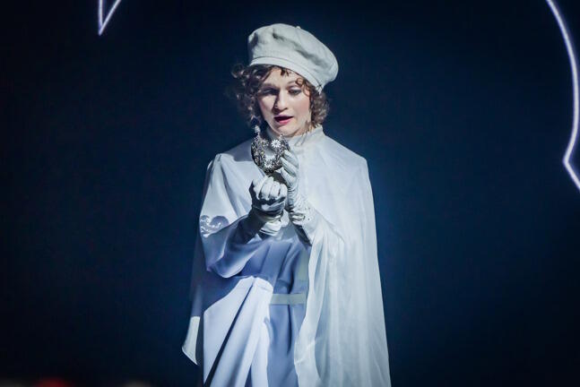 Die Bielefelder legen sich mit bewährter Musicalkompetenz ins Zeug. Regisseurin Janina Niehus erzählt versiert am Stücktext entlang. Der Zug ins Märchenhafte zeigt sich unterstrichen, das Politische weitgehend ausgeblendet. Dass die Ignoranz der Romanows die Revolution erst hervorrief, bleibt der Andeutung überlassen. Die Figuren schweben durch ein Paralleluniversum, das in einigen Punkten dem unseren gleicht. Grausam mag auch in jener anderen Welt bisweilen das Leben wohl sein, niemals aber ziellos, sinnentleert und ohne Hoffnung. Durch Revolution und Pariser Exilaristokratie hindurch findet Anastasia sich selbst, um sich - daran lässt selbst der offene Schluss keinen Zweifel - unbekannte Weiten zu erschließen. Sebastian Ellrich, Bühnen- und Kostümbildner sowie Lichtdesigner in Personalunion, stellt ein transparentes Gerüst aus Treppe und Bögen auf die Bühne, das vom Eisenbahncoupé bis zur Stiege des Palais Garnier für vieles taugt. Leuchtsilhouetten vergegenwärtigen jeweils die Newa- und Seine-Metropole. Die gesamte Personnage hüllt Ellrich in reinstes Weiß. Anzüge, Kostüme und Roben zeigen sich von der Garderobe zu Beginn des letzten Jahrhunderts abstrahiert.
