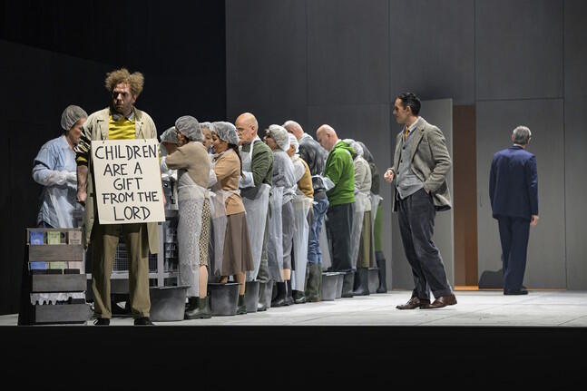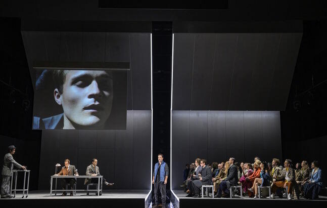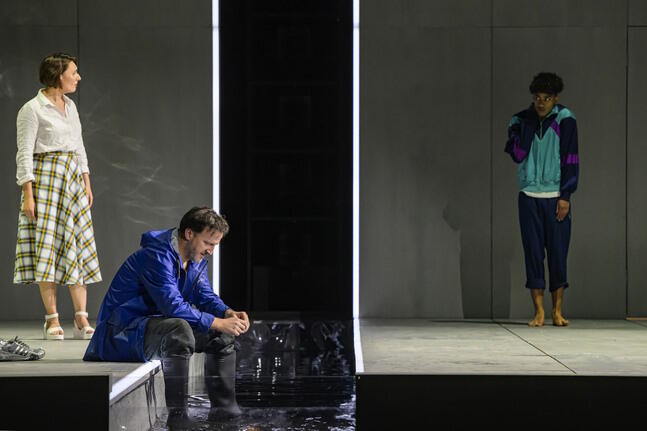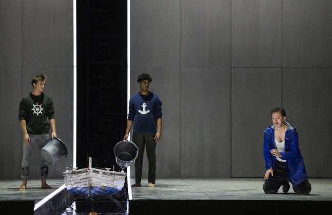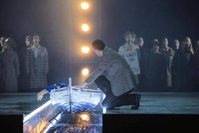 In Benjamin Brittens 1945 uraufgeführter Oper Peter Grimes sind ganz gewiss eigene Lebenserfahrungen des Komponisten eingesickert, die er als Schwuler hat machen müssen zu einer Zeit, da Homosexualität ein absolutes Tabu war. Aber gehen wir heute, 80 Jahre später, anders damit um? Offener? Toleranter? Ja, es gab eine Phase, in der das Thema mehr eine Nebensache war. Inzwischen aber wendet sich das Klima wieder, vor allem dort, wo die Rechten immer mehr an Einfluss gewinnen und das Wahlvolk deren Parolen zum Teil willig nachläuft. Und denen geht es nicht nur um Schwule und Lesben sondern um jede Form von Anderssein, das angeblich nicht ins Stadtbild eines Dorfes gehört und deshalb abzulehnen ist. Insofern behandelt Peter Grimes ein zeitloses Sujet. Zeitlos ist auch der Ort, in den Matthew Wild seine Inszenierung ansiedelt. Dem südafrikanischen Regisseur geht es um den Kern der Geschichte: um Hass, Vorverurteilung, Ausgrenzung, das Gefühl einer Gemeinschaft, im Recht zu sein, recht zu haben. Conor Murphy baut dazu eine im Prinzip unspektakuläre Bühne: zwei glatte Spielflächen, auf der Rückseite durch hohe Wände begrenzt, von oben durch eine schiefe Ebene gedeckelt - hermetisch. In der Mitte ein Flüsschen, das die Spielflächen voneinander teilt. Ein idealer Raum, der Gelegenheit bietet, den Fokus ganz auf die Psychologie der handelnden Personen zu richten. Interessant auch die Idee, die "Sea Interludes", Brittens verbindende orchestrale Zwischenspiele mit Videosequenzen zu bebildern. Hier wird sichtbar, was sich manch einer im Dorf als Theorie zurechtgelegt hat, wie denn Grimes' Junge wohl zu Tode gekommen sein mag. Und die Menschen im Publikum können sich überlegen, zu welcher der angebotenen Theorien er oder sie neigt.