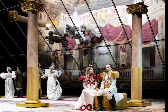 Die große Spiegelwand macht wirklich etwas her. Schräg hängt sie über der Bühne und zeigt das, was die Zuschauer normalerweise nur von vorn sehen, gleichzeitig von oben. Mit diesem Kniff erzeugt Bühnenbildnerin Heike Vollmer im zweiten Akt der Operette Wiener Blut einen optischen Rausch tanzender Festgäste im prachtvollen Palais des Grafen Mitrowski - für die barocke Ausstattung sorgt der gespiegelte Bildteppich. Auch Kostümbildnerin Denise Heschl lässt sich nicht lumpen: Opernchor und Ballettcompagnie bringen in prächtigen Gewändern den Wiener Kongress zum Tanzen.