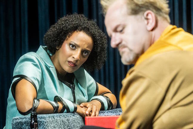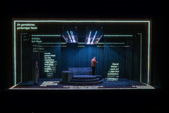 Der Abend beginnt mit einem Gespräch zwischen McNeal und seiner Ärztin (Pauline Kästner), die versucht, ihm die lebensbedrohende Gefahr seines Alkoholmissbrauchs klar zu machen. Ohne Erfolg bei diesem Egomanen. Gerade in diese Situation kommt der Anruf aus Stockholm. Der Literaturnobelpreis soll McNeal verliehen werden, dessen letztes Buch „Evie“ ein besonderer Erfolg war. Er hatte es ganz aus einer weiblichen Perspektive geschrieben. Die Preisrede in Stockholm ist ein Plädoyer für die Überlegenheit des menschlichen Genies, dem die künstliche Intelligenz nichts entgegenzusetzen hat. Dabei hat McNeal selbst das Buch mit KI geschrieben. Und außerdem hat er sich hemmungslos aus den Tagebüchern seiner Frau Jessica, die Selbstmord beging, bedient. Thiemo Schwarz gelingt mühelos der Wechsel vom sexistischen Macho zum Preisträger, der sich wie ein Kind freuen kann. Sein psychotischer Sohn Harlan wird einfühlsam von Moritz Klaus gespielt. Er wirft dem Vater vor, die Tagebücher seiner Mutter verwendet zu haben, worauf dieser ihn zum Schweigen bringt, indem er ihm Jessicas Aufzeichnungen vorliest, in denen sie den sexuellen Missbrauch Harlans beschreibt. Immer wieder dreht sich alles um diesen toxischen Mann, alle anderen werden mehr oder weniger zu Nebenfiguren degradiert. Sei es eine Literaturagentin (Friederike Wagner) oder die junge Reporterin der New York Times (Fnot Taddese). Francine Blake (Claudia Hübbecker) war eine Geliebte McNeals, auch ihre Geschichte hat er zu seiner gemacht.