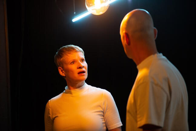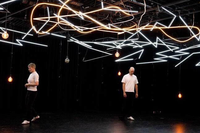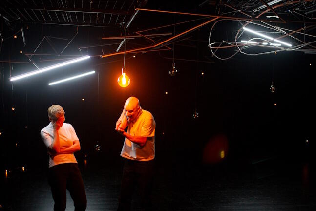 Dieser sehr intime, berührende Abend findet passenderweise im Studio statt. So erleben die Zuschauer das Geschehen hautnah mit. Ein Bühnenbild im eigentlichen Sinne gibt es nicht, nur verschiedene Lichtschlaufen und Glühbirnen auf unterschiedlichen Höhen. Das passt hervorragend zu der Geschichte der zwei Personen, die verschiedene Phasen ihrer Beziehung durchlaufen.