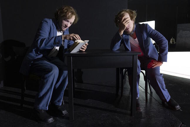 Auf der Bühne erscheint Alexej Iwanowitsch, der Ich-Erzähler des Romans und als Hauslehrer angestellt bei einem pensionierten, abgehalfterten und verarmten russischen General (kurios gegeben von Stefan Hunstein). Er beklagt das Heute und hofft auf das Morgen: „Morgen wird alles besser. Morgen wird alles richtig gut. Morgen wird alles anders!“ Mit dieser Hoffnung auf ein unbestimmtes Morgen beginnt und schließt das Stück. Auch nach zwei Stunden bleibt nichts als das Morgen. Wieder ist es Alexej, der sinniert: „Und Morgen? - Morgen bin ich… Morgen…Morgen…“. Doch diesen Alexej gibt es auf der Bühne gleich zweimal, ein bis auf die unterschiedliche Körpergröße exaktes Double sitzt da mit einem Roman in der Hand und greift schon bald in den Text seines Doppelgängers ein. Beide tragen Silikonmasken über den Kopf gezogen, die die Gesichter seltsam anonymisieren und ihnen die gleiche Frisur aufsetzen.