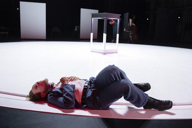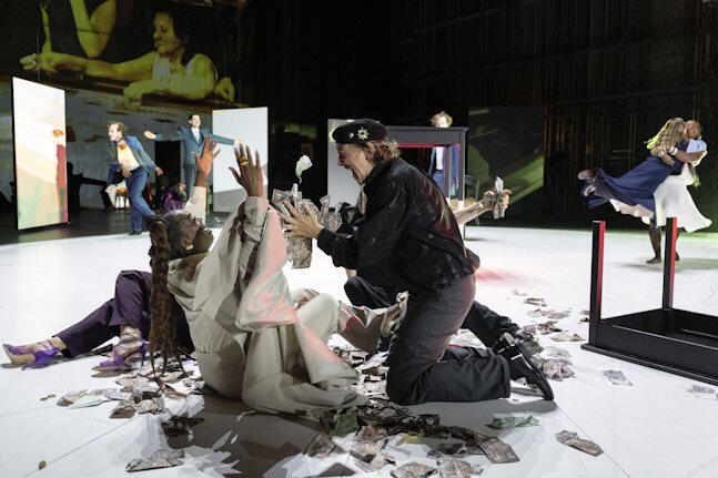 Die große Bühne ist relativ pur: eine helle Drehscheibe, in der Mitte ein hochgebockter Tisch, auf dem sich irgendwann das Geld anhäufen wird, bevor es sich dann verflüchtigt, auf dem Boden verteilt wird oder gar ins Publikum fliegt. Auf dem Außenring rollt eine glänzende rote Kugel - stärker als zwei Fußbälle - und simuliert die ganze Bühne als einen einzigen Spieltisch, während auf der Bühnen-Rückwand gelegentlich ein Video von einem Spielsaal eingeblendet wird, auf dem man unter den Spielern auch den Intendanten des Hauses Johan Simons entdeckt.