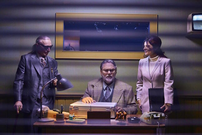 Bigotterie und Gotteslästerung führen zu Bild 3 der Aufführung. Düsenjäger überqueren das Dorf. Lavinia Novak geht wieder ins Büro: in Militäruniform. In ihrem Office werden nun Soldaten rekrutiert. Auch ein Mann mit einem Baby im Arm bekommt ein Maschinengewehr in die Hand gedrückt; ein Deserteur wird abgeholt. The Cures „Alone“ gibt nun den Ton an: „This is the end of all the songs we sing…“ Paare, die sich heimlich zu separieren versuchen, werden unglücklich; jemand steigt mit Gasmaske aus einem vernebelten Haus. Die nach wie vor hyperrealistischen, an Gregory Crewdsons inszenierte Fotografien erinnernden Bilder werden brutaler, blutiger, waffenstarrend, und auch der Sound der Musik wird im heraufziehenden Krieg disharmonischer. Aber Voges inszeniert auch die Schönheit des Schreckens - bis zum bitteren Ende, als Leichen das dörfliche Schlachtfeld bedecken.