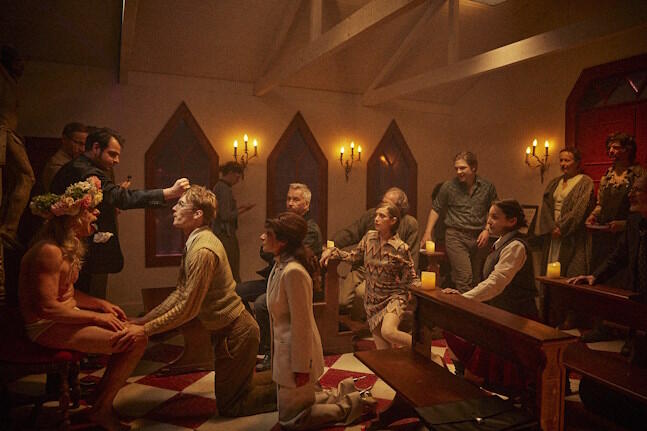 Der Tote steht wieder auf - ein Leidensmann, aber auch eine Erlöserfigur. Zu Orgelmusik wird er ganz kirre… um nicht zu sagen: quicklebendig. Uwe Schmieder spielt so wie wir ihn aus seiner Dortmunder Zeit unter Kay Voges kennen: Er gibt einen verschmitzten Filou und Leute-Verarscher. Er lässt sich zum Christkönig krönen, verabreicht den bigotten Gläubigen das Abendmahl, streckt ihnen die Zunge raus und lacht sich kaputt. „Alors on danse“, fetzt die Musik los - Tommy Finke hat einen grandiosen Soundtrack zu Voges‘ Bildertheater gesampelt.