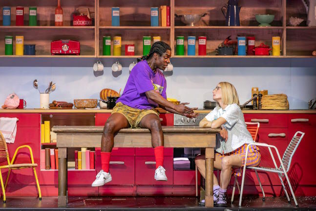Doch bevor es richtig losgeht, tritt „Die Professorin“ (Natalie Hanslik) aufs Proszenium, stellt sich vor, fragt auch Kinder im Publikum nach ihrem Namen und erzählt dann mit unnötiger Ausführlichkeit die voraufgegangene Geschichte Emil und die Detektive. Auch die erste Szene, die Einladung mit Mutter (Tabea Bettin), Emil (Belendjwa Peter) und Professorin spielt noch auf dem Proszenium, bevor sich dann endlich der Vorhang öffnet, ein wundervolles, reetgedecktes Haus freigibt und ein grandioses Spiel mit tollen Ideen, Tanz, Musik und begeisternder Akrobatik seinen Lauf nehmen kann.