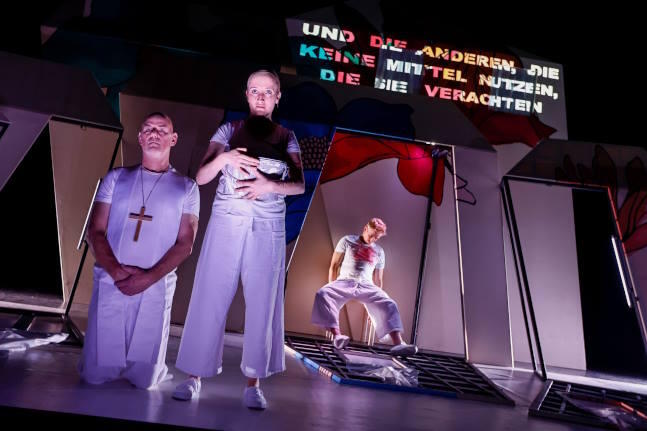 Es sind vor allem Schulklassen, die die Kathrin-Türks-Halle in Dinslaken zur Premiere bevölkern. Max Frischs parabelartiges Drama Andorra ist wieder mal Schulstoff – zum wievielten Male eigentlich seit seinem Erscheinen im Jahre 1961? Es ist ein Stück voller Stereotype, merklich vom Zahn der Zeit angenagt. Aber vielleicht behauptet es gerade wegen dieser Stereotype hartnäckig seine Relevanz: Papierene Figuren lassen sich immer wieder auf zeitgenössische Weise interpretieren. Man muss ihnen nur Leben einhauchen. Um es gleich vorweg zu sagen: Dem Team um Regisseur David Schnaegelberger gelingt das an der Burghofbühne Dinslaken nur in eingeschränktem Maße. Und doch ist der Aufführung angesichts der Grundkonstellation des im Stück behandelten Konflikts die Aktualität nicht abzusprechen. Denn es geht unter anderem um zunächst verborgenen, später immer deutlicher hervortretenden Antisemitismus. Vor zehn Jahren noch hielten wir das Thema in Deutschland – von sektiererischen Minderheiten abgesehen – für weitgehend überwunden. So kann man sich täuschen…