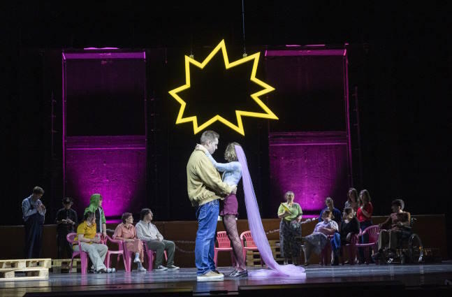 Die einzige Requisite ist ein hüfthohes Kiefernholzregal quer über der Drehbühnenmitte, auf dem siebzehn Personen sitzen, die im Stück fünfundzwanzig Rollen übernehmen werden. Eine kommt nach vorne an den Bühnenrand (Lea Strobe), stellt sich vor als Wang, Wasserverkäufer von Sezuan, der Hauptstadt der chinesischen Provinz Sezuan, in der so große Armut herrscht, „dass nur noch die Götter helfen können“ und tatsächlich seien „einige der höchsten Götter schon unterwegs“ nach Sezuan. Die Regisseurin Damira Schumacher kürzt das „Vorspiel“, lässt das übrige Personal hinter dem Regal verschwinden und schickt in strahlendem Licht drei Götter (Jamie Cremerius, Tekin Karacali, Theresa Schild) in silbrig glitzernden Kostümen vor einem funkelnden Lametta-Behang auf die Bühne. Von göttlicher Würde keine Spur: der männliche Part mit Sonnenbrille und Shorts, alle drei zu Karikaturen verfremdet. Es gilt, wenigstens einen guten Menschen zu finden, der ihnen Quartier gibt, damit „die Welt bleiben kann, wie sie ist“. Da die Brecht’schen Götter auch in Duisburg weder allmächtig, noch allwissend sind, ist es an Wang – der als Vermittler zwischen Götter- und Menschenwelt fungiert - diesen guten Menschen zu finden. Nach mehreren Absagen bleibt nur die Prostituierte Shen Te (überzeugend gespielt von Lulu Feuser) die sich zur Aufnahme der Götter überreden lässt. Die zahlen großzügig mit irdischem Geld, mit dem Shen Te einen Tabakladen eröffnet. Als ihr bescheidener Wohlstand von ihrer Umgebung rücksichtslos ausgenutzt wird, erschafft sie ein Alter Ego, den Vetter Shui Ta, der mit kapitalistischer Kälte und Rücksichtslosigkeit den Laden rettet und erweitert.