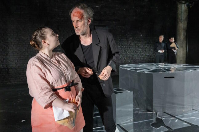 Dahingehend bewegt sich die Inszenierung nicht primär zwischen den Hauptfiguren Eve und Adam, sondern zeichnet viel mehr das Bild einer gesamten Gesellschaft vor Gericht. Dennoch gelingt es Patrick Dollas als Dorfrichter Adam eine besonders einnehmende Performance hinzulegen. „Als judiziert ich selbst den Hals ins Eisen mir?, witzelt er als beinahe liebenswerter, fast tattrig netter Herr, nur um diesen Eindruck einige Momente später mit erstaunlicher Bedrohlichkeit und Dominanz aus dem Weg zu räumen. Zwar keiner Lüge scheu gelingt es ihm nicht seine internalisierte Misogynie zu verstecken und demaskiert damit zunehmend den Ursprung seines Verhaltens im Schutze patriarchaler Strukturen. Lulu Feuser als Eve steht hingegen lange Zeit in stiller Verzweiflung neben den Scherben des zerbrochenen Krugs, teilweise unsicher ob über den Krug oder über sie gesprochen wird. Feuser lässt mit stark körperlicher Abneigung Angriffe unterschiedlichster Natur über sich ergehen, bis sie die Kraft aufbringen kann, mit der Wahrheit herauszubrechen und dem Albtraum ein Ende zu setzen.