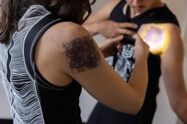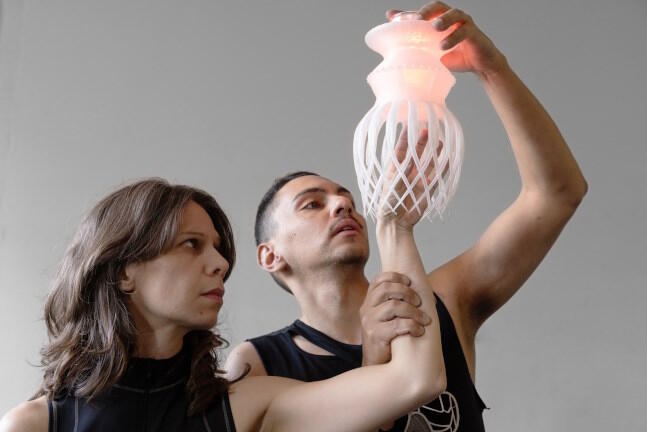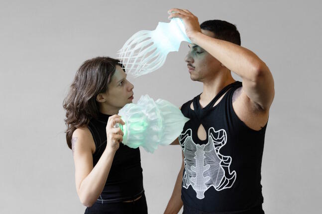 Pech gehabt, wenn man wie der Schreiber dieser Zeilen sein Mobile Phone im Auto vergessen hat: Gabriel Carneiro und Bianca Mendonça tragen QR-Codes auf Arm, Brust und Rücken, und wenn man sie scannt, erscheint ein Gemälde auf dem Bildschirm des eigenen Telefons. Leider konnte es der Autor nur flüchtig bei einer auf dem Handy einer freundlichen Mit-Besucherin betrachten. Vielleicht sollte das Gemälde eine Erinnerung an eine vergangene Kultur sein? An eine Kultur, in der es noch Kultur gab? Die angedeutete Wirbelsäule nebst Lunge und Blutbahn, die die Performer auf ihre schwarzen, ihnen ein androgynes Gepräge gebenden Shirts gedruckt haben, gehört auf jeden Fall zur Gegenwart dieser Geschichte. Also zur Zukunft: Das 2019 gegründete DESLOCAR Kollektiv bezeichnet seine Performance als eine „ethisch-dystopische Erzählung über Extraktivismus, Macht und Widerstand“.