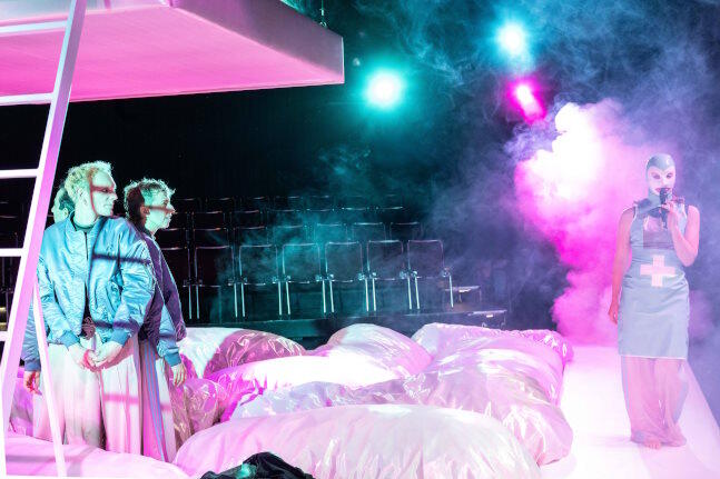Ein vierköpfiges Ensemble bewegt sich im Kleinen Haus auf einer zentralen Spielfläche, die mit Kissen bedeckt und von einem Laufsteg umgeben ist; mittig erhebt sich ein Hochbett, in das sich K. immer wieder zurückziehen muss. Denn neben den Mühen der „Transition“ durch Operationen und Therapien wird in Matters Werk auch das Leiden an Long Covid thematisiert. Wesentliche Figuren, die K. umschwirren, sind Ilay, auf ähnlichem Weg und in liebender Nähe mit K. verbunden, und Aaron, ein nur scheinbarer Fitnessstudio-Macho.