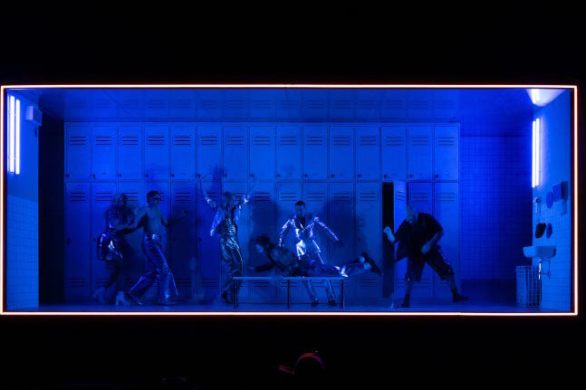 Sebastian Sommer inszenierte Cyrano am Rheinischen Landestheater auf höchst erfrischende Weise. Rap-Musik-Fetzen sind immer wieder eingestreut. Alexander Grüner hat die Bühne mir Leuchtstoffröhren, die die Farbe von Szene zu Szene wechseln, eingerahmt. Als Bühnenbild sehen wir eine Art Schrankwand mit diversen Fächern, so wie man sie in der Umkleidezone eines Sportzentrums erwarten könnte. Sie bietet unterschiedlichste Möglichkeiten für Auftritte und Abgänge. Die Schauspieler tragen futuristisch anmutende Kostüme aus glänzendem Stoff und grellen Farben. Was gut zu dem häufigen Imponiergehabe passt. Die Sprache steht im Mittelpunkt. Rhythmus, Alliteration, Artikulation, Betonung und Pausen bestimmen den „Flow“ dieser so intensiven Inszenierung. Wobei alle Mitglieder des Ensembles zu loben sind, die mit viel Spielfreude agieren: Simon Rußig, Vera Hannah Schmidtke, Tim Richter, Anton Löwe und Stefan Schleue. Ganz besonders aber Benjamin Schardt als Cyrano, der perfekt auf der Klaviatur der Gefühle spielt. Mal ist er der hoffnungslos Verliebte, dann wieder der kampferprobte Soldat. Ihm ebenbürtig Katrin Hauptmann als selbstbewusste Roxane.