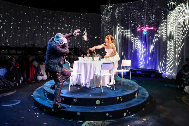 Ausgerechnet der schräge DJ (in Oberhausen zunächst angemessen nervig, später überraschend sympathisch gespielt von Daniel Rothaug) weist mit einer berührenden Anekdote über seinen Vater, der den Titel des Films „The Color Purple“ („Die Farbe Lila“) mit „The Colored People“ verwechselt und glücklich über seinen nur halb verstandenen Inhalt ist, den aufgedrehten, aber innerlich unglücklichen Menschen dieses Dramas den Weg zur ultimativen Weisheit. Kaum jemand bekomme, was er sich wünsche. „Aber du bekommst irgendwas, und du wirst es lieben.“ In den Trümmern des Urknalls gibt es immer noch etwas, das man lieben kann. Diese Erkenntnis wird zum Wendepunkt in López‘ Stück. Ob seine Protagonisten ihre Chance zur glücklichen Wende in ihrem Leben nutzen werden, bleibt offen. Aber der Rezensent hat’s ja gesagt: Eine perfekte Hochzeit ist ein perfektes Silvesterstück. Wir haben die Möglichkeit zum Glück. Ergreifen wir die Gelegenheit – nicht nur im Neuen Jahr.