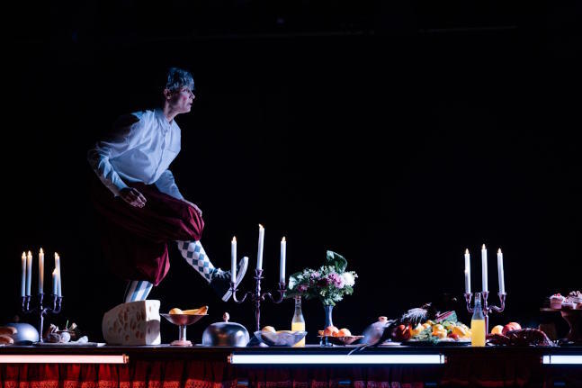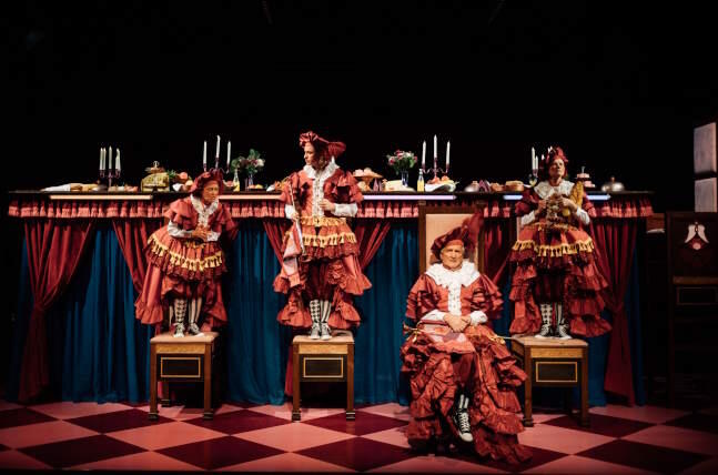 Irgendwie sehen sie aus wie die Londoner Beefeater. Purpurrot gekleidet, ausgestattet mit Wappen und Standarte, treten die vier Fanfaren ihren Dienst an. Sie sind des Landes beste Naturtrompeter, Das Spielen auf der klappen- und ventillosen Naturtrompete erfordert äußerste Disziplin, aber diese waltet nicht nur beim Tuten und Blasen, sondern auch in ihren gemessenen, exakt choreografierten Bewegungen. Hohle Rituale bestimmen das Leben am Hof. Die Trompeter nehmen Platz – unten vor dem riesigen, erhöhten Tisch, den die Bühnenbildnerin Marlena Gundlach offenbar aus dem Audienzraum des russischen Präsidenten entwendet hat. Ganz unten - denn mögen sie auch die Protagonisten unseres Theaterstücks sein, so sind sie doch die Untertanen. Hoch droben über ihnen wartet ein opulentes Frühstücksbuffet auf den Herrscher.