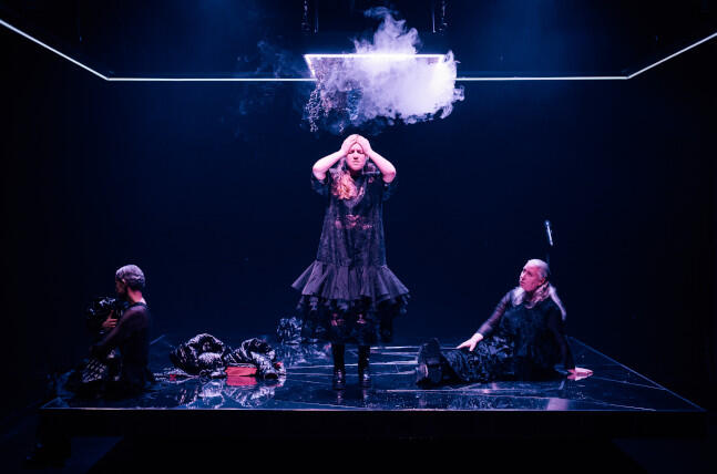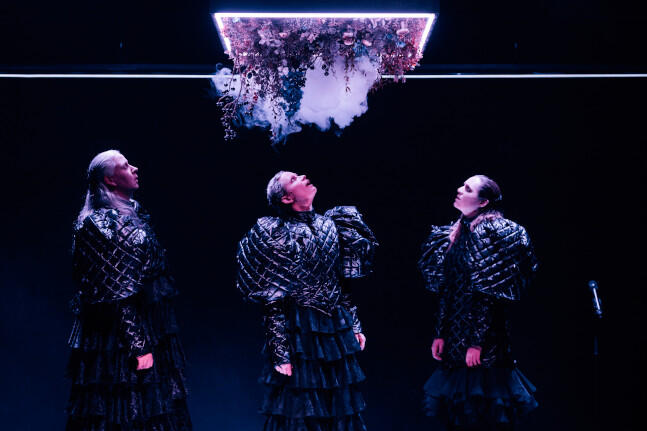 Schwarze Wände, außer einem Mikro keine Requisite. Leise Musik aus dem Off. Schattenhaft bewegen sich drei Figuren auf der blitzblanken Bühnenfläche, bei aufscheinendem Licht als Frauen zu erkennen, alle in bodenlangen, schwarzen Volantröcken und glänzenden Steppjäckchen mit opulenten Puffärmeln - eine starke, zeitlose Aufmachung (Bühne und Kostüme Franziska Isensee).