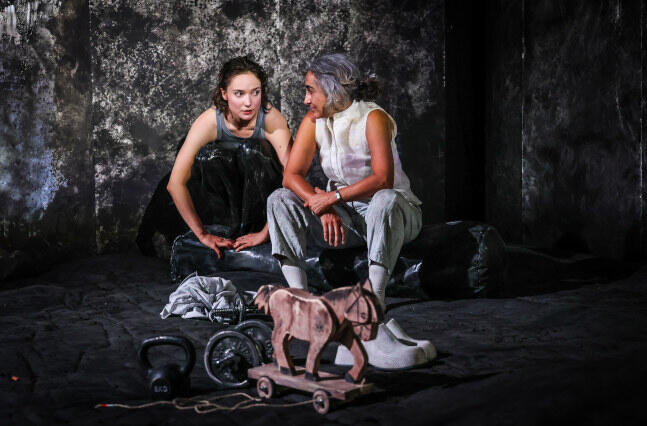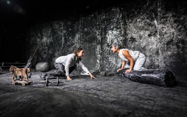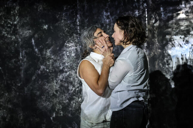Eine grandiose Idee der Bühnenbildnerin Aliki Anagnostakis, den klaustrophobischen Raum nicht als glitzerndes Studio, sondern trist, karg und dreckig als öden Seelen-Acker der Protagonistin darzustellen. Dorthin nehmen uns die beiden bravourösen Schauspielerinnen, Özlenim Meier (als Mutter Cennet) und Blanka Winkler (in wechselnden Rollen) für gut hundert Minuten mit.