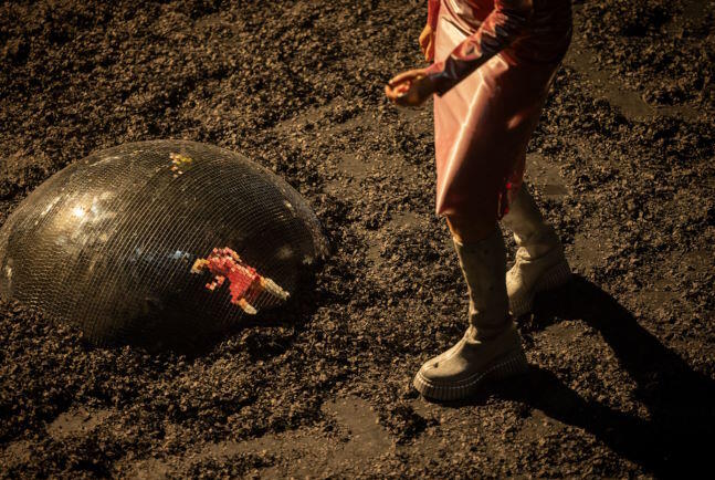 Die Metamorphose jedenfalls gelingt, auch mittels zahlreicher - stark typverändernder - Kostümwechsel, wobei nach dem Geschmack des Rezensenten Omagbitse Omagbemi in Sachen modischer Kreativität den Vogel abschießt. Verändern sich mit Kostümen, mit Kleidung auch Identitäten? Zur vollständigen Erkundung des anfangs fremden Gegenübers gehört es auch, die andere in unterschiedlichen Rollen zu erleben. Visuell und akustisch gibt es nach etwa der Hälfte der Vorstellungsdauer harmonische, schmeichelnde Momente. Sogar die verwüstete Landschaft bekommt eine positive Konnotation, wenn die drei Performerinnen zu asiatisch anmutenden Klängen staunend, beschwörend die glänzenden Halbkugeln besteigen und die Landschaft harmonisch in ihre Choreografie einbeziehen. Doch bleibt die Harmonie nicht bestehen; am Ende wird der Sound, der zu großen Teilen von Mieko Suzuki am rechten Bühnenrand selbst produziert wird, noch einmal extrem disharmonisch; Lichtdesigner Nico de Rooij aber lässt einen wunderbaren Lichtdom entstehen, der vielleicht für die Utopie einer leuchtenden, schönen künftigen Welt steht. Ein poetisches Schlussbild mag diese Spekulation stützen.