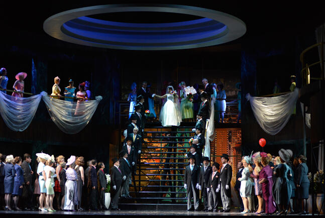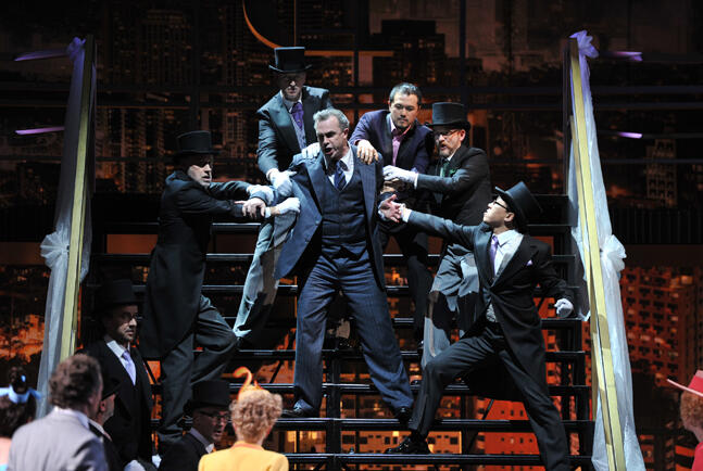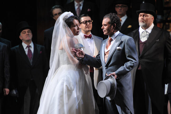 Lohengrin ist kein solcher „Kraftmensch“, wird ja auch von göttlicher Macht gelenkt. Doch selbst mit himmlischer Rückendeckung ist eine glückliche Konfliktlösung nicht garantiert. Wagner hat durchaus geschwankt, ob er sein Werk - wie dann zuletzt geschehen - mit dem schmerzlichen Abschied Lohengrins enden lassen oder ihm einen hoffnungsvollen Schluss geben sollte. Der wiederum könnte freilich durchaus, wie beim Ring häufiger geschehen, inszenatorisch ins Pessimistische umgedeutet werden. In ihrer Lohengrin-Inszenierung fasst Sabine Hartmannshenn solche Gedanken wie in einem Brennspiegel zusammen. Der Titelheld singt seine letzten (der Reinkarnation Gottfrieds geltenden) Worte bereits aus dem Off, Ortrud bricht nicht zusammen, sondern tritt als Prinzip der alten Ordnung (die man nur bedingt als reaktionär bezeichnen sollte) König Heinrich gegenüber, der wie ein Börsenmakler mit seinem „Heerrufer“ bereits wieder finanziellen Dingen zugewandt ist. Indem er ganz zuletzt ein Schriftstück zerreißt, scheint sich bei ihm allerdings tiefere Einsicht durchzusetzen, doch dauerhaft für eine glückliche Zukunft? Immerhin konnte ET-Lohengrin (wie nicht zuletzt die Kostüme Susana Mendozas darlegen) von der irdischen Gesellschaft vorübergehend vereinnahmt werden: aus dem Jeans-Träger wird ein gestylter Party-Boy.