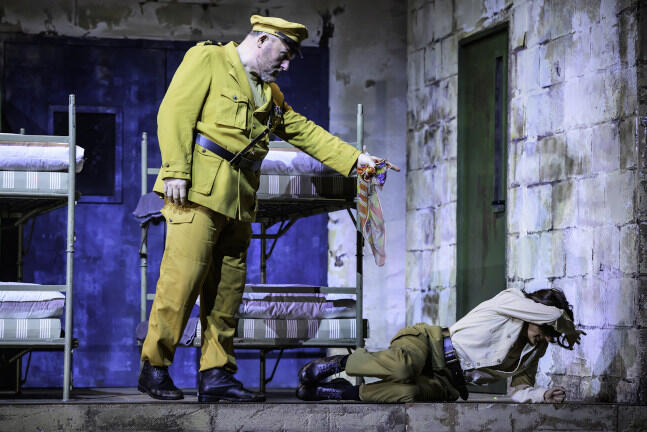 Auf der anderen Bühnenseite kommt ein Schlafzimmer zum Einsatz, wenn das liebende Paar sich im ersten Akt zurückzieht oder der eifersüchtige Feldherr seine Frau am Ende ermordet. Für das Liebesduett hat sich Leo Muscato etwas Besonderes ausgedacht: Er lässt das Paar vom Rotlicht der Dunkelkammer ins Schlafzimmer hinüberwechseln, doch bevor Otello zur Gattin ins Bett steigen kann, hängt symbolträchtig sein Gürtel von der geöffneten Hose herab. Er verzweifelt, sie tröstet, und der Zuschauer rätselt: Soll das etwa seine baldige Raserei erklären? Hat nicht der Komponist Giuseppe Verdi an dieser Stelle zum poetischen Libretto Arrigo Boitos ein Bild puren Glücks entworfen, das den nachfolgenden Wahn des Titelhelden um so erschütternder macht?
