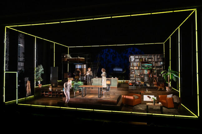 Die Bühne dafür bietet auch das Theater Bonn und verlegt den Konflikt aus Frankreich direkt in die eigene Stadt. In der häufig erwähnten Poppelsdorfer Allee wird aus Véronique Veronika, aus Michel Michael, Alain wird zu Andreas und nur Annette darf ihren Namen behalten und büßt lediglich die französische Aussprache ein. In einer sehr geschmackvoll eingerichteten Wohnung, die von Neonröhren begrenzt wird, verlieren auch die Paare in Bonn zunehmend ihre Hemmungen und ihren Anstand. Hausregisseur Simon Solberg stützt seine Inszenierung besonders auf den Umstand dieser zunehmenden Dissolution. Dafür findet Solberg zunächst auch passende Mittel; anfängliche Spannungen, in Momenten, in denen die Situationen zu eskalieren drohen, werden mit düsterem Wummern untergelegt, Videoprojektionen setzen in Kombination mit dem Licht der prägnanten Neonröhren entsprechende Stimmungsimpulse und die Bühne wird mit Fortschreiten der Konflikte zunehmend abgebaut, bis die Figuren nicht mal mehr “vernünftig” zusammensitzen können und dem allgemeinen Chaos unterliegen.