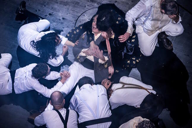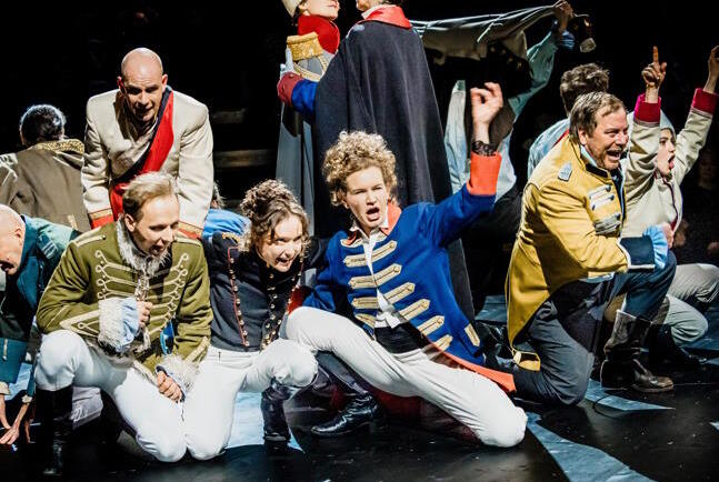Nach der zweiten Pause wird es bitterernst. Napoleon zieht mit seinem Heer gen Moskau. Dabei wird der selbsternannte Kaiser Frankreichs weder als „Kleiner Kaiser“ (ein Klischee der englischen Propaganda aufgrund unterschiedlicher Längenmaße), noch als herrschsüchtiger Imperator von der besonnenen Claudia Hübbecker gegeben. Er ist nichts als ein sich irrender Mensch. Das übrige Ensemble wird in schwarzen Stiefeln und hellem Oberteil zur marschierenden Soldateska. Moskau verschwindet im Bühnen-Qualm, die Beleuchtung tut ein Übriges zur Kriegsstimmung. Pierre Besuchow taucht in schmuddeligem Outfit völlig verändert noch einmal auf, jetzt entschlossen, Napoleon zu ermorden. Doch er gerät in Gefangenschaft und entgeht nur knapp der Exekution als vermeintlicher Brandstifter Moskaus. Er wird von Partisanen befreit und „er wurde ein anderer“, heißt es im Text, doch seine Frage nach dem „richtigen Leben“ bleibt unbeantwortet.