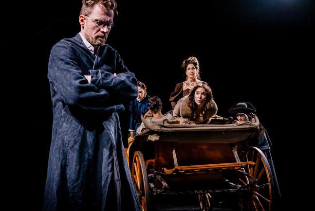 In schnellem Szenen-, Rollen- und Kostümwechsel zaubern dreizehn Ensemblemitglieder sowohl ein Panorama russischen Lebens als auch Episoden der Napoleonischen Kriege auf die Bühne. Es sind an die vierzig Figuren, die aus Hof-, Adels- und Militärkreisen, aber auch als leibeigene Bauern und Soldaten auftreten. Mal spielt das Geschehen in Petersburger Salons, Moskauer Fürstenhäusern oder der russischen Provinz, dann aber auch in Feldlagern oder - in ergreifenden Bildern - auf angedeuteten Schlachtfeldern. Dabei verwebt sich Historisches mit Fiktivem sowohl in den Erzählsträngen als auch bei den Figuren. Zur Orientierung fürs Publikum gibt’s an den Rückwänden gut lesbare Beschilderungen der über hundert Szenen mit Orts- und Inhaltsvermerken.