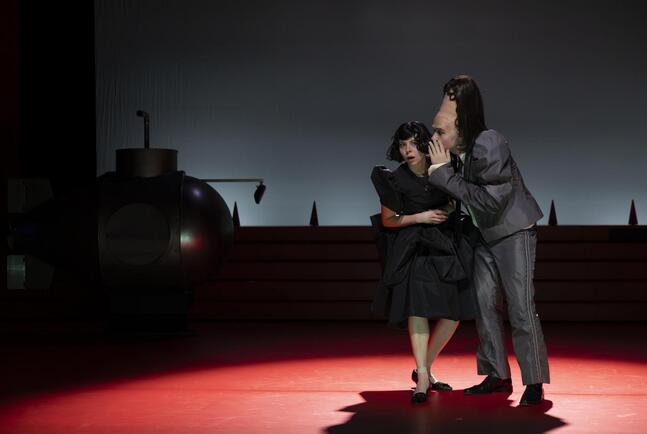 Wir befinden uns im „Maschinenraum der Demokratie, im Kraftraum des Nationalstaats, im Bienenstock der Bürokratie.“ Prosaischer ausgedrückt: Vor uns liegt das Großraumbüro einer deutschen Behörde im späten 21. Jahrhundert. Ein riesiges Breitwand-Fenster erlaubt den Blick nach draußen. Und dort: ist Wetter. „Draußen: Wetter“ - mehr als das meldet man nicht, nicht in der Tagesschau, nicht im Großraumbüro, wo die Menschen über Alltägliches reden. Man sieht es bloß, wenn man im Parkett des Kleinen Hauses im Musiktheater im Revier sitzt: graue Wolken, Staub in der Luft, fliegende Blätter. Kein schimmernder Dunst mehr über Gelsenkirchen County, sondern eine ziemlich undurchdringliche Suppe. Im ersten Bild zeugt eine dünne Rauchfahne am linken Rand noch von industrieller Aktivität.