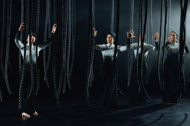 Völlig dunkel ist die Bühne in den ersten 45 Minuten der Performance. Erst in der letzten Szene, die in Berlin spielt, wird das Licht heller. Die in der Heimat Verfolgten sind angekommen in der Fremde. Dort gibt es Sicherheit, was aber nicht notwendigerweise gleichbedeutend ist mit Geborgenheit. Ein Besuch im legendären Techno-Club Sisyphos löst Anspannungen und verspricht vorübergehendes Glück, bevor die in der Freiheit Angekommenen von Traurigkeit befallen werden: The dog of sadness snatches their legs. Immerhin trägt eine der Schauspierinnen nun wieder ein wunderschönes weißes Kleid mit weichen, fließenden Formen, das von den wallenden Stricken aus dem bedrohlichen ersten Akt harmonisch umspielt wird. Zwei Performerinnen aber sind mit einem solchen Seil angekettet an einen Baum - die Erinnerung an die Heimat lässt die im Exil Befindlichen nicht los.