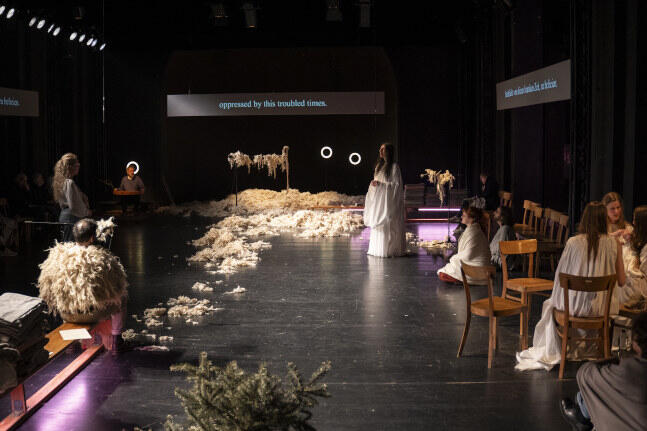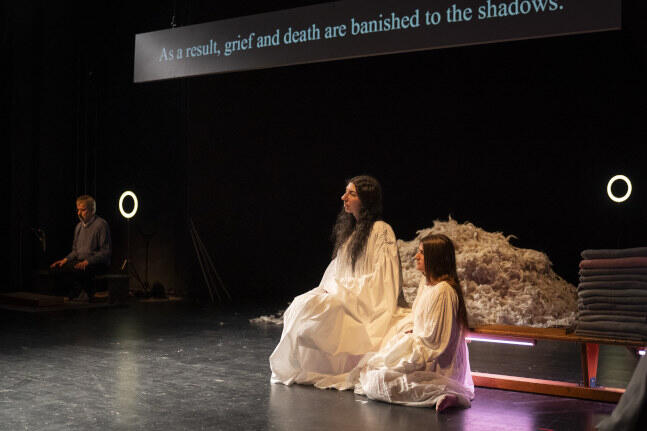Die Ordensfrau hatte während ihrer Meditationen Unmengen von Visionen, die wohl auch manchem Kirchenoberen nicht geheuer waren. Sie setzte sich ein für die Bewahrung der Schöpfung und betrachtete Mensch und Natur als eine unteilbare, untrennbare Einheit. Anagoor verlängert ihre fast 1000 Jahre alten Zukunftsvisionen und -konzepte in die Gegenwart, die Gedanken der Heiligen dabei sanft aktualisierend. Den Menschen als Teil der „Familie der Dinge“ zu betrachten, angesichts der Zerstörung unseres Planeten eine neue Verbindung zur Natur zu suchen – auch das ist ein Anliegen, das die Künstler mit Hildegard von Bingen teilen. Von deren Theorien der Verflechtung des Menschen mit Pflanzen und Tieren kommen sie auf bedrohte Korallenriffe, das Schmelzen der Polkappen und letztendlich den drohenden Zusammenbruch der Demokratie, ohne dass die Aufführung den Tonfall der Poesie und der Trauer verlässt. Allenfalls wenn plötzlich von „organisierten“ Schiffbrüchen von Migranten-Booten, von „genehmigten“ Völkermorden etc. die Rede ist, droht die Inszenierung in ideologisches Fahrwasser mit politischen Kampfparolen zu geraten.
