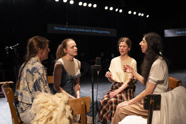 Die Augen sollen wir schließen, bittet das aus Schauspielerinnen des Theaters an der Ruhr und des italienischen Theaterkollektivs Anagoor zusammengesetzte Ensemble; unserem Atem sollen wir lauschen. Ujujuj, das wird ein mächtig meditativer Abend, denkt man, wie auch anders bei einem Abend zu den Lobgesängen der als Heilige verehrten Hildegard von Bingen (1098 – 1179). „Freunde dich mit den Engeln an, bewache einen ruhigen Geist“, heißt deren Rat; Mäßigung predigt sie, Maßhalten und Ausgewogenheit in allen Dingen. Schon regt sich innerer Widerstand beim stets ein wenig rastlosen Rezensenten, heißt es nicht: Good girls go to heaven, bad girls go everywhere“? Dieses Versprechen fordert der Rezensent auch für den maskulinen Teil der Menschheit ein, aber er ahnte ja, was ihn an diesem Abend erwartete.