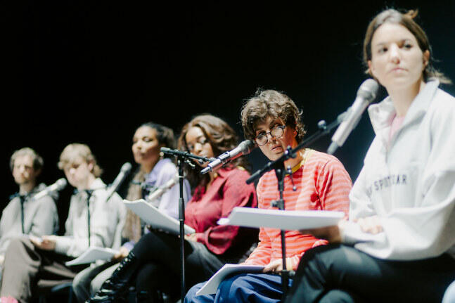 Und um die behauptete Entwicklung dieser Produktion geht es im ersten Teil der Aufführung, die uns in ihrem Arrangement zunächst fürchten lässt, in eine szenische Lesung geraten zu sein. Tatsächlich lesen die Acht uns ihre Mail-Korrespondenz, die sie angeblich in der Vorbereitungsphase zu diesem Abend führten, so lebendig und stimmungsvoll vor, dass sich schon die einzelnen Charaktere herausbilden. Da ist die verantwortungsbewusste, engagierte Veronika Nickl, der versonnene Lukas von der Lühe, der leicht abwesende Puk Brouwers, die temperamentvolle Stacyian Jackson, die nebenher ständig von Sorgen um Kind und Kita geplagt wird und schließlich die engagierte Abenaa Prempeh, die zu gern die Führung des Ganzen übernommen hätte, sie dann aber Mona, die angeblich extra aus den USA eingeflogen wurde, überlassen muss. Alle werden mit ihren echten Vornamen angesprochen, tragen ganz individuelle Alltagsklamotten, was den angeblich realen Bezug zur Stückentwicklung des Abends unterstreicht.