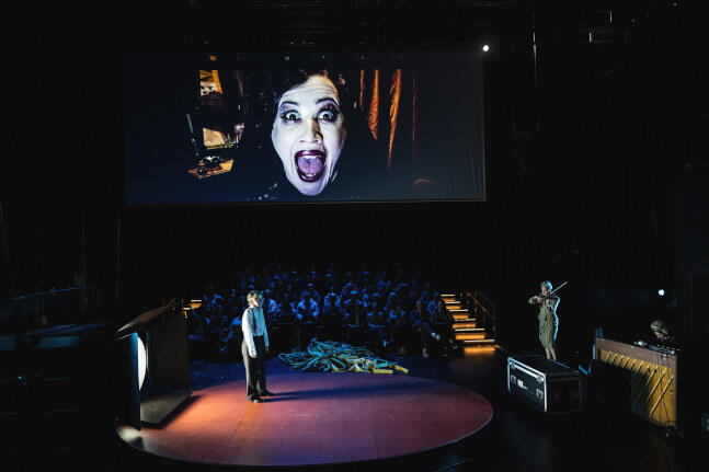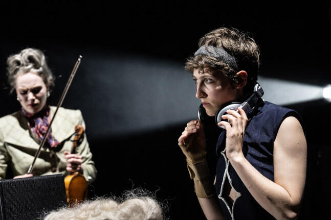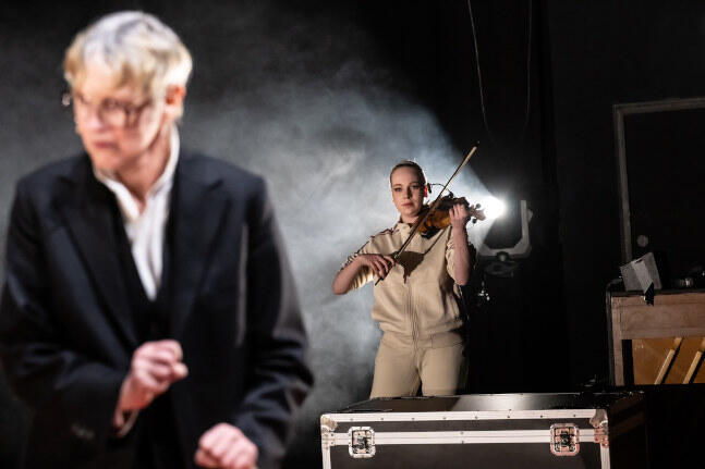 Zur Aufführung des Stücks kommt es bei Thomas Bernhard und seinem Bruscon nicht. Im Grunde ist es ein Quasi-Monolog über die Möglichkeiten und Unmöglichkeiten des Theaters, das unser Protagonist exzessiv liebt und hasst, wie auch die Leute seiner Truppe, ausschließlich Familie: Tochter Sarah (Flavia Berner, Sohn Ferrruccio (Alisa Lien Hrudnik) und Ehefrau Agathe (Minna Wündrich).Um der Gefahr der Monotonie in der thematischen und sprachlichen Wiederholung (ein bis an die Grenze ausgereiztes Stilmittel in Bernhards Werk) auszuweichen, durchzieht die Inszenierung Mozarts Fantasie in D-Moll, arrangiert für Violine und Klavier, live gespielt von Flavia Berner und Alisa Lien Hrudnik, womit die beiden Theater-Kinder zusätzliche Präsenz erhalten und außerdem mit ihren ganz nebenbei erwähnten Online-Auftritten einen Neuanfang setzen.