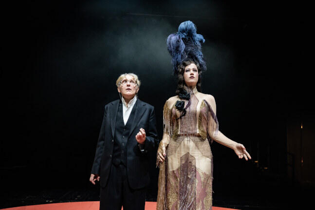 Obwohl der Prinzipal damit renommiert, in Berlin den Faust und in Zürich den Mephisto gespielt zu haben und jetzt in seinem Meisterwerk Das Rad der Geschichte alle Größen der Welt von Nero bis Hitler auftreten zu lassen, fällt er dann auf die Knie und überprüft auf allen Vieren die Brüchigkeit der Bühne. Ein großes Fragezeichen, das die Regisseurin Christina Tscharyiski mit diesem Bild gleich zu Beginn hinter die wortgewaltige Selbsteinschätzung der ersten Szenen setzt. Und in der Tat liegt diese Spannung zwischen Selbstbestätigung und Angstbewältigung über der gesamten Inszenierung, großartig erspielt von der grandiosen Rosa Enskin als Theatermacher Bruscon im schwarzen Dreiteiler mit schlabbrigem Mantel.