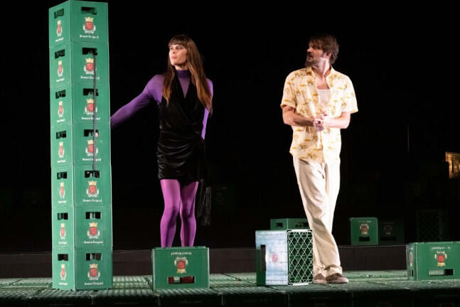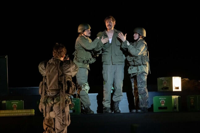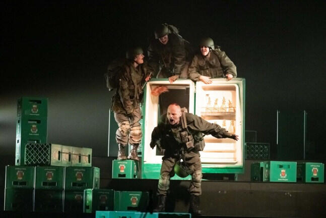 600 grüne Plastikbierkästen bedecken die Bühne. Sehr variabel eingesetzt als Haus, als Deckung, ja sogar als Gewehre. Ab und an wird ein Panzer von oben herabgelassen und schon ist er die Kantine der Witwe Begwick. Alles verändert sich ständig. Immer wieder werden die Songs von Paul Dessau gespielt und gesungen. Brecht nannte seine Hauptfigur einen großen Lügner und unverbesserlichen Opportunisten. Christoph Roos gelang eine Inszenierung, die im Laufe des Abends immer mehr an Spannung gewinnt. Wobei er sich auf ein sehr gutes Ensemble verlassen konnte. Cornelius Gebert überzeugt als Galy Gay, der sich - nach einigem Sträuben - total manipulieren lässt und sogar zum Führer der Truppe wird. Bruno Winzen gibt den Sergeant Charles Fairchild, einen skrupellosen Kriegshelden. Die drei Soldaten der Maschinengewehrabteilung werden von drei Frauen gespielt: Marie Eick-Kerssenbrock, Liv Wagener und Julia Staufer. Eines der Argumente, warum sie den Geschlechtertausch interessant finden, ist, von einer weiblichen Perspektive aus eine Männlichkeit zu entwickeln, die sie im privaten Alltag vielleicht als bedrohlich empfinden würden. Simon Schofeld ist die verführerische Witwe Begwick. Er findet es spannend, diese weibliche Figur in einem extrem männerlastigen Umfeld, dem Militär, zu spielen. Das Publikum honorierte den Abend mit herzlichem Applaus.